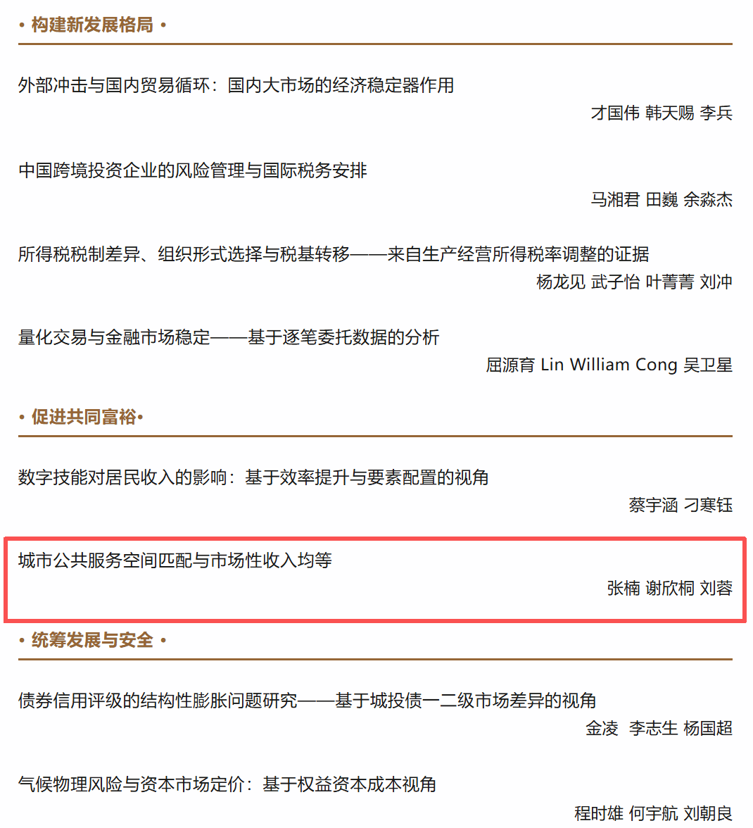 近日,我校经济与管理研究院区域经济学专业2024级博士研究生谢欣桐(通讯作者)和财政税务学院张楠教授、刘蓉教授共同撰写的论文《城市公共服务空间匹配与市场性收入均等》在《经济研究》2025年第12期刊出。