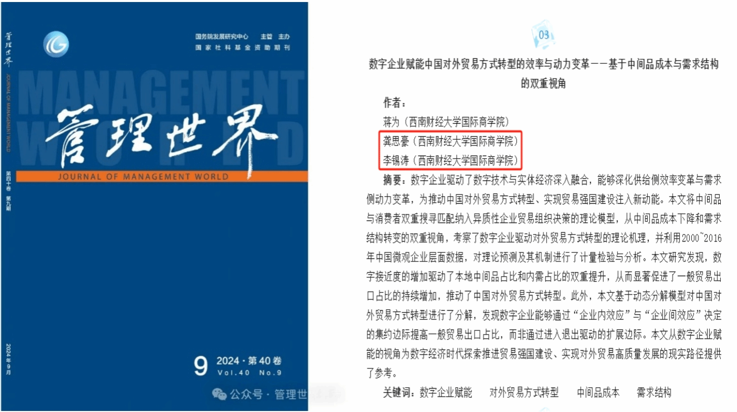 近日,我校国际商学院2019级国际贸易学专业博士研究生龚思豪和2021级国际商务专业博士研究生李锡涛,在合作指导教师蒋为教授指导下共同撰写的论文《数字企业赋能中国对外贸易方式转型的效率与动力变革——基于中间品成本与需求结构的双重视角》在《管理世界》2024年第9期刊出。